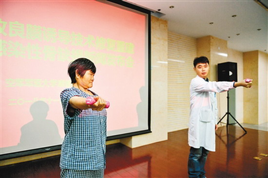 本报讯(王睿 从墨涵 记者 阮班慧)“17年了,我的右臂只能耷拉着, 现在能提东西啦!”11月14日上午,术后4个月来,空军军医大学唐都医院复查的患者刘大姐高兴地展示自己右臂的恢复状况。该院采用膜诱导技术结合负载抗生素的硫酸钙、磷酸钙复合物,成功为右肱骨感染性骨缺损的刘大姐进行长约17.2厘米的修复重建。据教育部查新工作站查新结果显示,该技术为世界首创、且膜诱导技术修复肱骨感染性骨缺损的长度也是世界最长纪录。标志着我国膜诱导技术治疗感染性骨缺损走向世界前列。