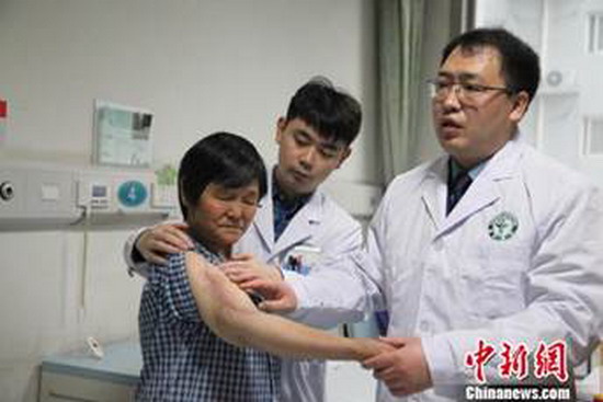 中新网西安11月14日电(王睿 丛墨涵)“十几年的疼痛一下就缓解了,我现在右臂能提东西啦!”14日上午,59岁的刘女士展示右臂的恢复状况。空军军医大学唐都医院日前采用膜诱导技术,结合负载抗生素的硫酸钙、磷酸钙复合物,为右肱骨感染性骨缺损的刘女士进行长约17.2厘米的修复重建。标志着中国膜诱导技术治疗感染性骨缺损的临床应用取得较大突破,开辟了新的治疗途径。