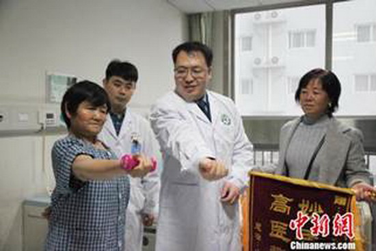 11月14日在唐都医院,患者展示手臂康复情况。记者 张宇明 摄