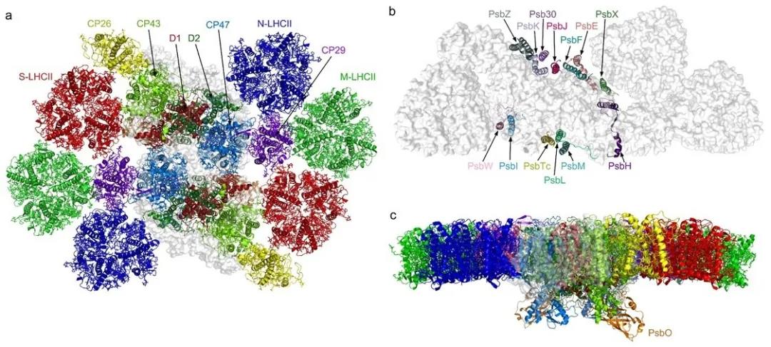 为了更进一步理解水下光合作用,研究人员还基于冷冻电镜技术解析了广泛存在的与高等植物具有相似光合作用的水生生物——绿藻(假根羽藻)光系统I(PSI)捕光复合体I(LHCI)超级复合体的结构,分辨率达到3.49埃。该结构揭示了包含有原核生物和真核生物亚基特性的13个PSI核心亚基,以及10个LHCI天线亚基的结构(其中8个形成一个双半环结构,其余2个形成一个额外的LHCI二聚体)。并与浙江大学医学院张兴研究组合作,解析了绿藻——莱茵衣藻完整的C2S2M2N2型PSII–LHCII超级复合体的冷冻电镜结构,分辨率为3.37埃。该结构显示,绿藻C2S2M2N2型超级复合体是一个二聚体,每个单体由位于中央的PSII核心复合体和环绕该核心的3个LHCII三聚体、1个CP26和1个CP29外围天线亚基所构成。