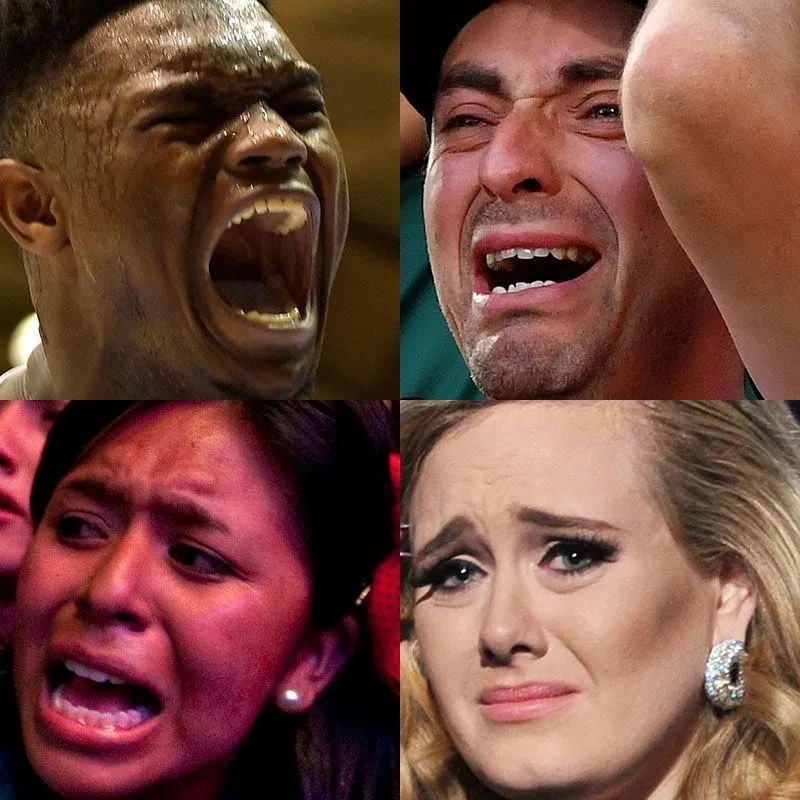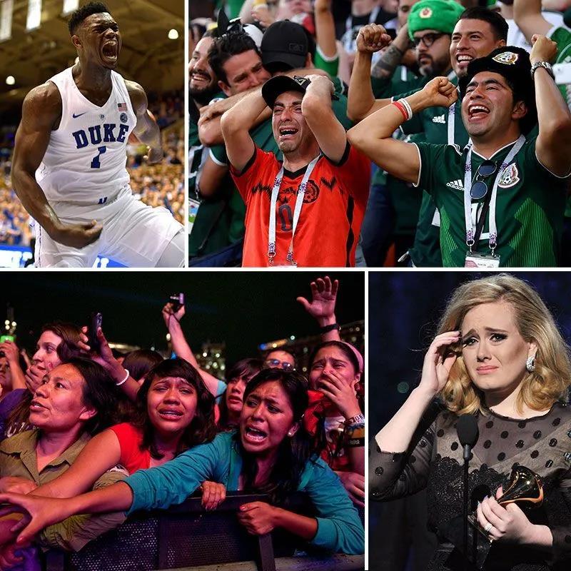 顺时针从左上起:篮球运动员Zion Williamson庆祝灌篮成功;墨西哥球迷欢庆世界杯小组赛晋级;歌手Adele赢得了2012年的格莱美奖;Justin Bieber的粉丝在墨西哥城的演唱会上哭泣。