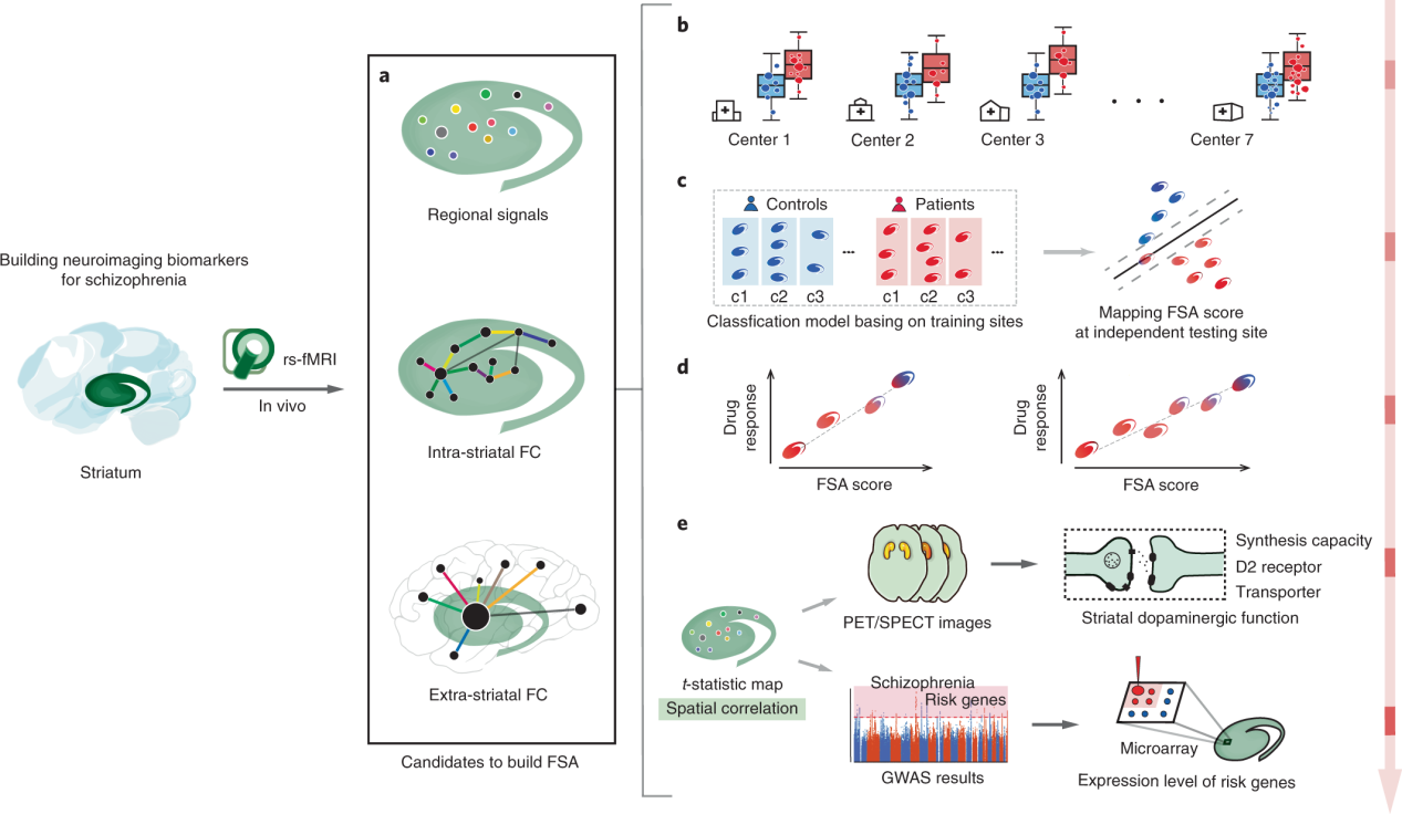 已有的多种证据初步提示脑内纹状体可能在精神分裂症的病理及治疗方面起着至关重要的作用。在此基础上,研究团队创新性地提出纹状体功能异常(Functional Striatal Abnormality, FSA)的概念,试图构建基于多水平多组学的精神分裂症精准诊疗研究框架(图一),在此基础上对精神分裂症患者的纹状体病理性功能异常进行个体化的定量评估与机制解析。该研究框架融合了多中心多水平多组学数据,利用了数据建模与机器学习技术,以纹状体功能异常为出发点,从生物标记的稳定性与可泛化性、个体化精准诊断与疗效预测模型、生物机制解析等方面系统阐述了FSA的有效性。