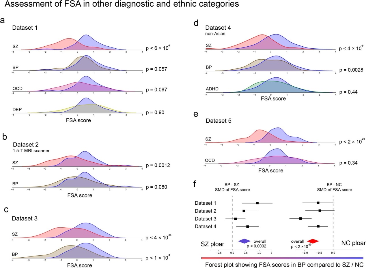 多种精神疾病在临床症状、遗传以及治疗等方面均存在着一定程度的重叠,目前临床上的诊断分类并不能很好地定义不同疾病之间的病理差异;相反,由于治疗效果的异质性存在,在诊断标签内部反而可能存在一些不同的病理机制。因此,研究团队试图评估FSA在其他五个不同独立中心的双向情感障碍,抑郁症,强迫症和多动症患者中的敏感性(图五),结果发现双相情感障碍的患者有显著的纹状体功能异常趋势(相比于正常对照),然而其程度显著弱于精神分裂症患者的平均水平。这意味着FSA有望跨诊断提供纹状体功能的异常评估,对未来的跨诊断精神疾病研究提供了重要的启示。