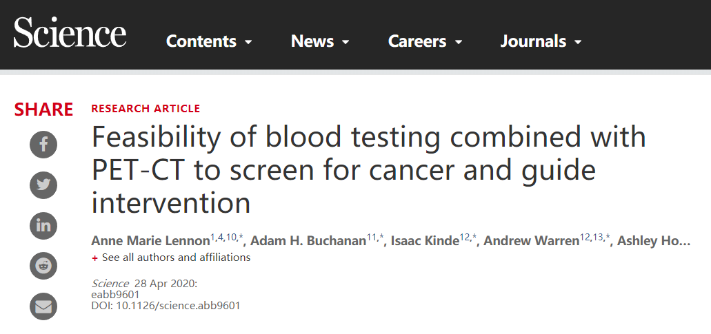 1. Feasibility of blood testing combined with PET-CT to screen for cancer and guide intervention