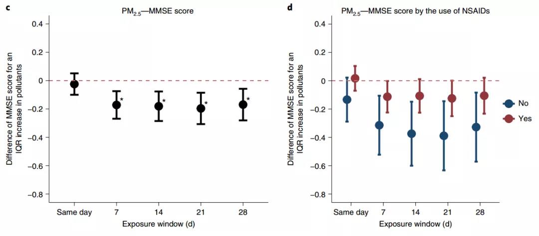 短期PM2.5暴露后,使用非甾体抗炎药的人比不使用非甾体抗炎药的人,认知能力的损伤更少。但非甾体抗炎药本身不会影响老年人群的认知功能,说明非甾体抗炎药可能有助于逆转短期PM2.5暴露导致的认知下降。在对炭黑的分析中也观察到类似的效果。这可能由于此类药物减少了神经系统的炎症反应;另一方面可能是由于药物会缓和PM引起的脑血管血流动力学障碍[4,5]。不过,研究人群受到长期平均PM暴露,这种长期暴露可能对短期暴露的研究结果有一定程度的影响;炭黑虽然是波士顿PM2.5的主要组成部分,但仅占这一地区PM2.5质量的7%左右,这可能会影响对PM2.5的总体估计;另外,长期使用非甾体抗炎药会造成药物在机体内的累积,这种累积剂量也可能对研究结果有一定影响。