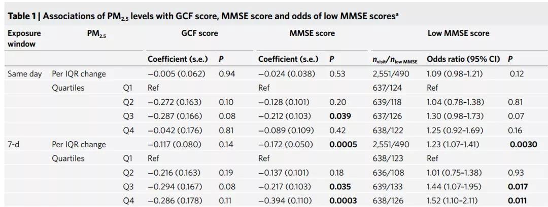 为了研究PM2.5短期暴露与老年人认知功能损伤之间的关系,研究人员首先调查了波士顿地区环境中短期(28天)的PM2.5水平,炭黑水平以及暴露人群的认知功能。以全球认知功能(GCF)和简易精神状态检查(MMSE)评分作为认知功能评价指标。然后进一步研究了非甾体抗炎药的使用是否改变了PM2.5暴露导致的老年人群认知能力损伤。以上研究是在规范性老龄化研究(NAS)中进行的,选取的人群为大波士顿地区的老年男性队列。这项研究共有954名参与者,一共进行了2551次随访。参与者的平均年龄69.22±7.12岁。其中超过75%的参与者使用了非甾体抗炎药,大多数人只服用了阿司匹林。28天暴露窗口内的平均PM浓度保持稳定,均值为10.77±3.04μg/m3。PM的主要有机成分,炭黑的浓度为0.92±0.35μg/m3。PM2.5和碳黑的浓度在不同暴露窗口之间均有很好的相关性。研究人员发现,PM2.5暴露浓度越高,GCF和MMSE得分越低,MMSE得分低的几率越大。这些结果说明PM2.5的短期暴露会损伤老龄男性人群的认知功能。