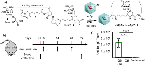 首先,作者们测试了Qβ诱导抗TACA的IgG抗体的能力。他们选择了在人类癌症中广泛存在的Tn作为TACA的代表性抗原,先得到NHS-Tn衍生物,进而合成Qβ-Tn共轭物(wtQβ-Tn),质谱分析表明wtQβ-Tn的每个Qβ颗粒平均修饰有370个Tn。然后作者们分别在第0、14和28天向小鼠注射wtQβ-Tn或wtQβ,收集血液,利用BSA-Tn作为包被抗原进行抗Tn IgG抗体的ELISA分析。结果发现wtQβ-Tn可以诱发大量的抗Tn IgG抗体,证明Qβ确实是能够有效诱导抗Tn IgG抗体反应的优秀疫苗载体。此外作者也用Qβ作为包被抗原进行了ELISA分析,发现wtQβ-Tn还能够大量的抗Qβ抗体,并且随后实验表明抗Qβ抗体的产生无法通过异源Prime-Boost方案来减少,这不利于疫苗的开发。