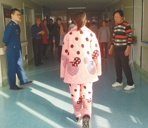 在父母和医生的鼓励下,贺琳琳小心翼翼地在医院病房的走廊上迈出步子