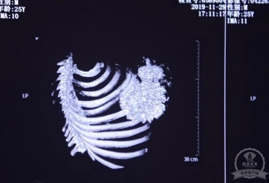 核心提示: 25岁男子右胸肋骨上长出“篮球”大小重达5.1公斤中的巨大肿瘤,大肿瘤犹如一个巨大的“乳房”压在他的胸口上,严重影响了他的正常生活和行动,12月10日,肿瘤切除术后,唐都医院的医生用3D打印钛合金弹性肋骨为其重建了胸廓。术后患者康复状况良好,近日将出院回家。