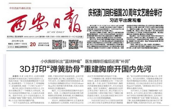 央广网西安12月20日消息(记者温超)记者19日从西安唐都医院获悉,该院近日成功完成一例巨大胸壁肿瘤切除联合3D打印胸肋骨植入物胸壁重建手术。