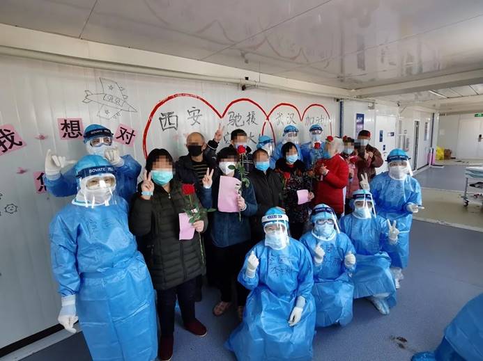 2月26日,火神山医院感染三科一病区出院了10名患者。李春梅和大家一起在病区制作了一个大大的“心连心”图案,在这面爱心墙上,患者留下了感激的话语,相互之间碰肘、合影……充满爱的场景。“你们也有家人,你们的家人也等待着你们平安回家,所以你们也一定要平平安安的回家,一定一定!”一位患者的话让李春梅眼眶红了又红,忍着没让眼泪掉下来。